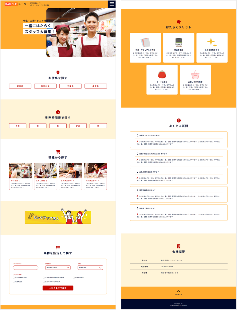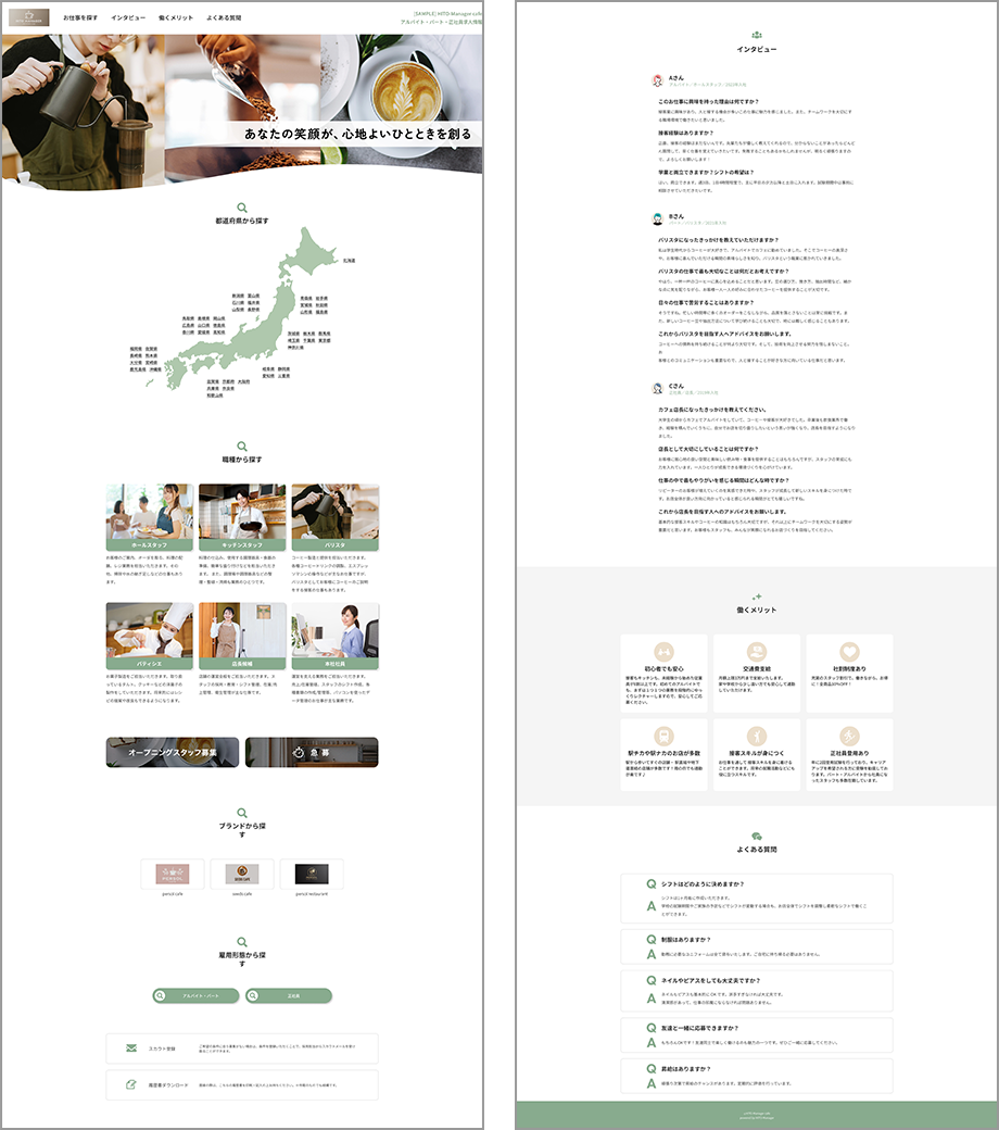 SEO対策により発見されやすい工夫はもちろんのこと、400社以上の採用サイトを作成した実績をもとに、求職者の行動分析データを活用。素早く求人原稿へつなげるために、エリア検索や職種検索など求職者のニーズに合わせた最適なページをデザインします。また、貴社理解を進めるための多彩なコンテンツを作成することが可能となっているため、働くイメージやブランドイメージを伝えることができ、質の高い応募者を獲得できます。